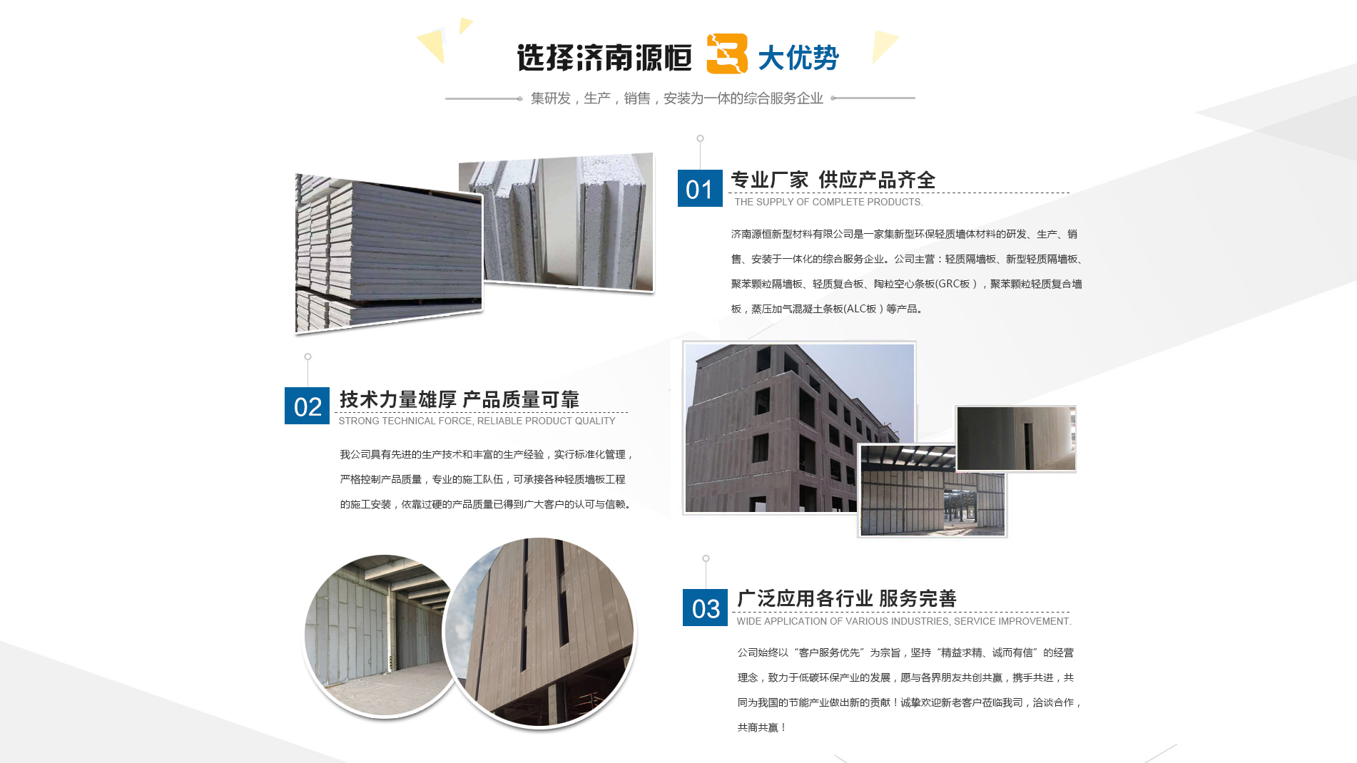 濟(jì)南源恒新型材料有限公司坐落于美麗的泉城濟(jì)南,是集新型環(huán)保輕質(zhì)墻體材料的研發(fā)、生產(chǎn)、銷售、安裝于一體化的綜合服務(wù)企業(yè)。我公司具有的生產(chǎn)技術(shù)和豐富的生產(chǎn)經(jīng)驗(yàn),為您提供輕質(zhì)隔墻板、新型輕質(zhì)隔墻板、聚苯顆粒隔墻板、輕質(zhì)復(fù)合板、陶??招臈l板(GRC板),聚苯顆粒輕質(zhì)復(fù)合墻板,蒸壓加氣混凝土條板(ALC板)等產(chǎn)品,本公司有專的施工隊(duì)伍,可承接各種輕質(zhì)墻板工程的施工安裝。輕質(zhì)隔墻板是國家推廣使用的新型輕質(zhì)、綠色無害建材,是墻改節(jié)能政策大力扶持的環(huán)保節(jié)能產(chǎn)品,是發(fā)達(dá)國家普遍采用的新型墻體材料。濟(jì)南源恒新型材料有限公司實(shí)行標(biāo)準(zhǔn)化管理,嚴(yán)格控制產(chǎn)品質(zhì)量,依靠過硬的產(chǎn)品質(zhì)量已得到廣大客戶的認(rèn)可與信賴。公司產(chǎn)品遍布各大城市,與國內(nèi)多家客戶建立了良好的合作關(guān)系。公司始終以“客戶服務(wù)優(yōu)先”為宗旨,堅(jiān)持“精益求精、誠而有信”的經(jīng)營(yíng)理念,致力于低碳環(huán)保產(chǎn)業(yè)的發(fā)展,愿與各界朋友共創(chuàng)共贏,攜手共進(jìn),共同為我國的節(jié)能產(chǎn)業(yè)做出新的...